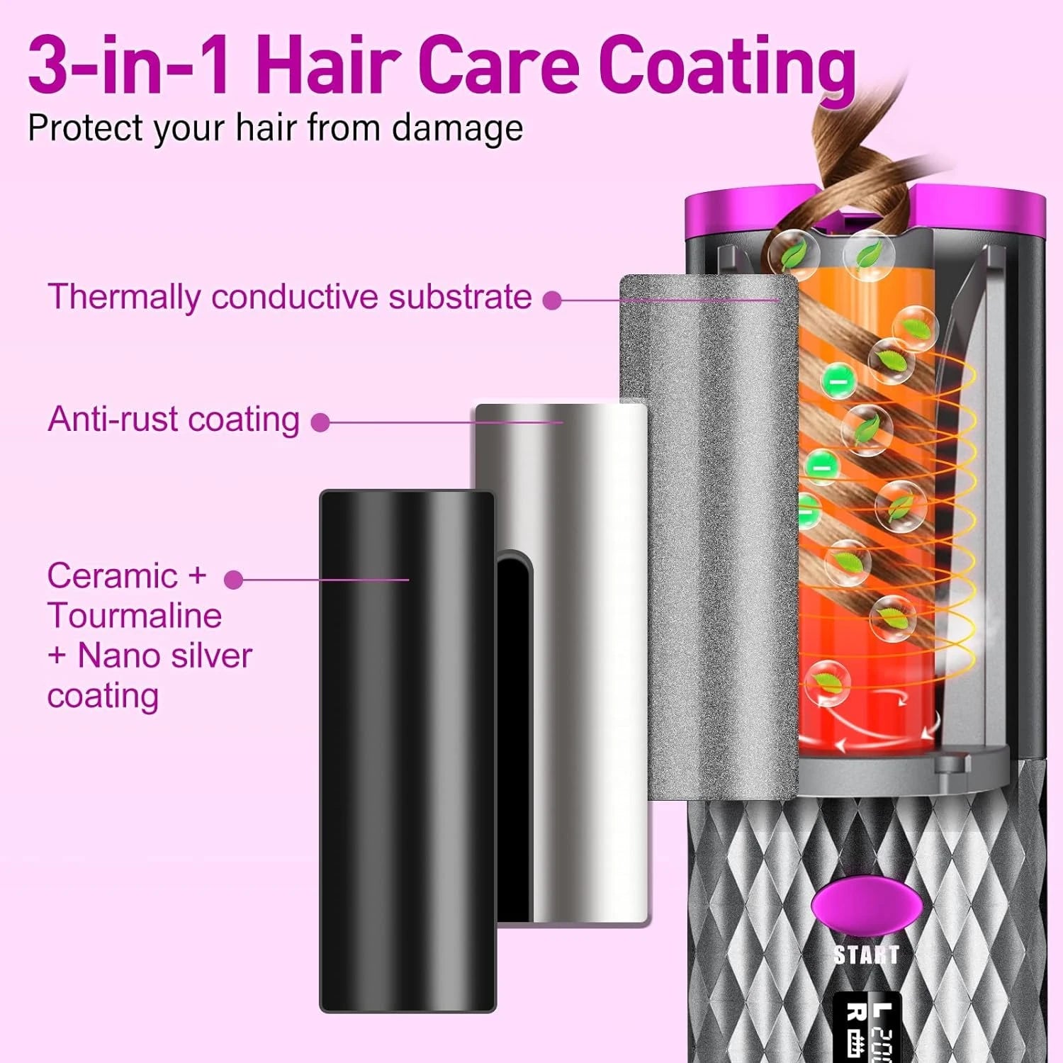 1. Transform your hairstyle on-the-go with our convenient, travel-friendly hair curling iron. This portable, rechargeable tool features a fast-heating wireless design and automatic rotation for effortless styling.